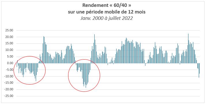 Depuis le début de l’année, tant les titres à revenu fixe que les actions ont inscrit des rendements négatifs. Ces données représentent une anomalie historique, car ce n’est que la deuxième fois en 40 ans que les deux catégories d’actif enregistrent des pertes pour deux trimestres consécutifs. Les quatre facteurs défavorables responsables de la volatilité des marchés, soit l’inflation élevée et persistante, les hausses de taux énergiques des banques centrales, l’augmentation des prix des produits de base à la suite de l’invasion de l’Ukraine par la Russie et les risques de récession qui planent à l’heure actuelle, ont déclenché une véritable tempête pour les deux catégories d’actif.