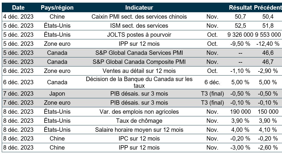Actions : L’indice S&P 500 a légèrement progressé vendredi, récupérant les pertes antérieures et clôturant la semaine en hausse de 0,75 %, à la suite de la déclaration du président de la Réserve fédérale américaine, Jerome Powell, selon laquelle la politique monétaire est « nettement en territoire restrictif ». L’un des meilleurs mois de novembre des 20 dernières années s’est terminé cette semaine, et les indices S&P 500, NASDAQ et TSX ont clôturé le mois en hausse de 8,9 %, 10,7 % et 7,2 % respectivement. Ces indices se heurtent maintenant à leurs seuils de résistance à court terme, ce qui pourrait entraîner un renversement de la tendance à court terme.