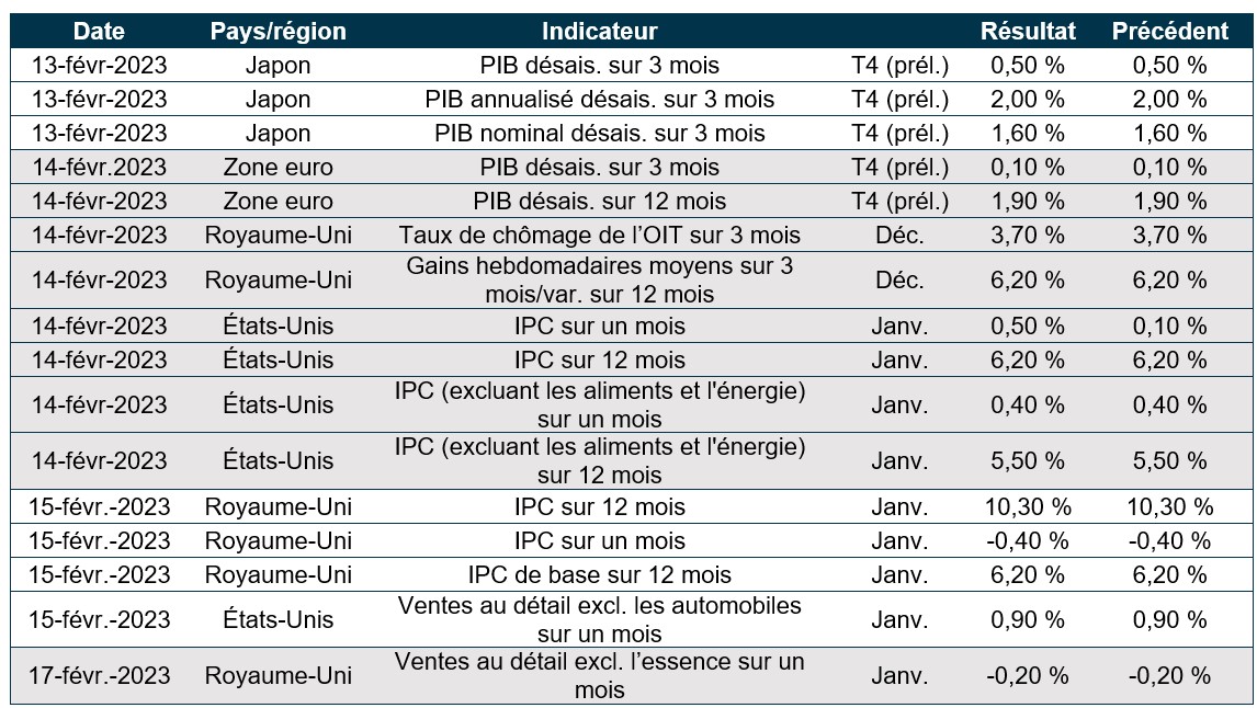 International – le PIB de la zone euro a crû de 0,1 %, l’IPC a ralenti à 8,5 %, la BCE et la Banque d’Angleterre ont toutes les deux relevé les taux d’intérêt de 50 pb, l’indice PMI de la Chine a fortement augmenté et les ventes au détail au Japon ont dépassé les attentes