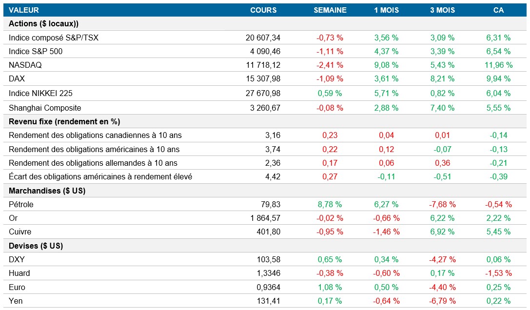 Titres à revenu fixe : Le marché des titres du Trésor a connu sa pire semaine depuis le début de 2023, les investisseurs réalisant que la Fed pourrait devoir maintenir les taux élevés plus longtemps. D’après les opérations sur le marché des produits dérivés, le taux directeur de la Fed devrait culminer à 6 %, soit environ 85 pb de plus que les attentes actuelles du marché. Les obligations canadiennes à 10 ans ont également clôturé la semaine en hausse de près de 25 pb, les données confirmant que le marché de l’emploi demeure tendu.