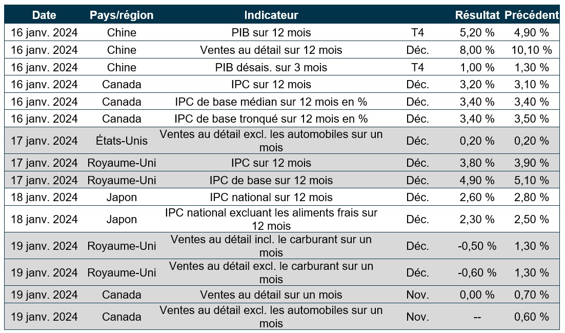 Titres à revenu fixe : À la suite de la publication des données sur les prix à la production, les investisseurs ont parié davantage sur une baisse des taux par la Réserve fédérale en mars, estimant la probabilité à 80 %, contre un peu plus de 50 % une semaine plus tôt. Les données économiques ont reflété les chiffres plus élevés que prévu des prix à la consommation, mettant en lumière les difficultés liées à l’atteinte de la cible d’inflation de 2 %. Les analystes s’attendent à ce que les événements géopolitiques et les répercussions potentielles sur l’inflation continuent de retenir l’attention du marché. L'ensemble des données économiques ont entraîné une légère hausse des cours obligataires cette semaine.