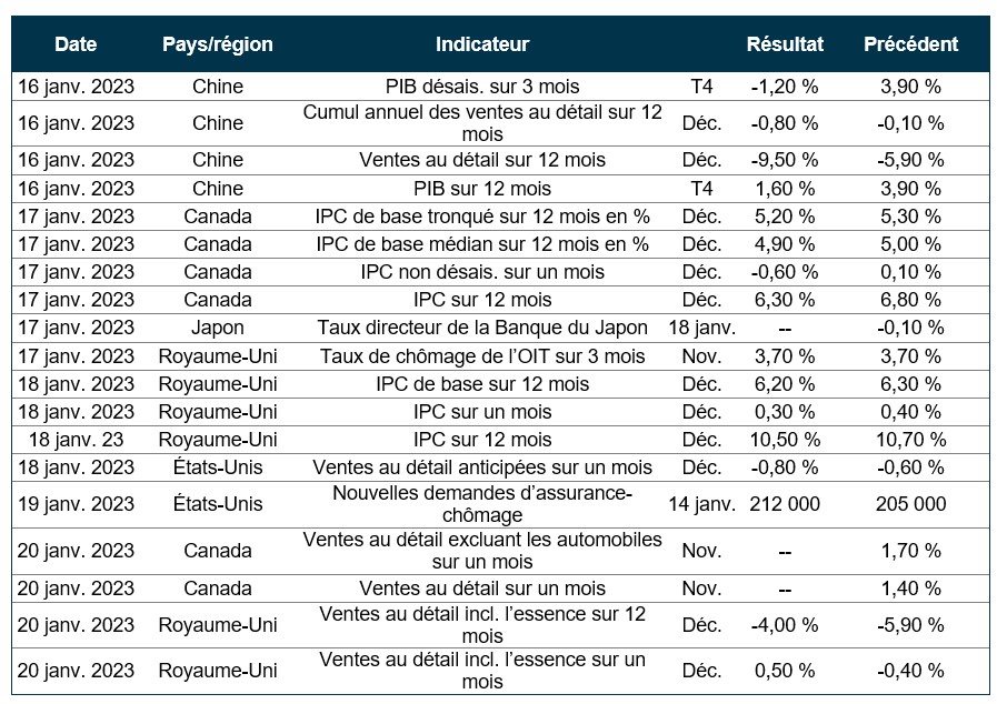 Actions : Le marché américain est resté vigoureux et a clôturé la semaine en hausse de 2,7 %, les données sur l’inflation inférieures aux attentes publiées vendredi provoquant un rebond des principales banques qui s’étaient d’abord repliées en matinée. Les marchés ont ouvert en recul d’environ 1 %, alors que certaines grandes banques divulguaient leurs résultats du quatrième trimestre et évoquaient l’incertitude entourant leurs perspectives pour 2023. La ronde des résultats du quatrième trimestre qui s’amorce aujourd’hui donnera aux investisseurs un aperçu de l’incidence de l’inflation sur les marges bénéficiaires.