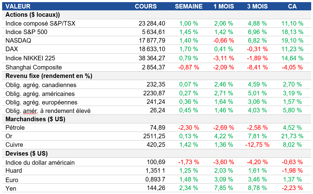 Actions : L’indice S&P 500 a progressé d’environ 1,5 % au cours de la semaine, se rapprochant de ses sommets historiques. Tous les secteurs de l’indice sauf un (énergie), ont inscrit des gains, reflétant l’optimisme soutenu des investisseurs. Maintenant que la ronde des résultats tire à sa fin, le marché attend d’avoir une meilleure idée de la stratégie de réduction des taux de la Fed, ce qui aura d’importantes répercussions sur les stratégies des investisseurs. Pour une troisième semaine consécutive, le marché canadien a clôturé en hausse, pour un gain d’un peu plus de 10 % sur l’année.