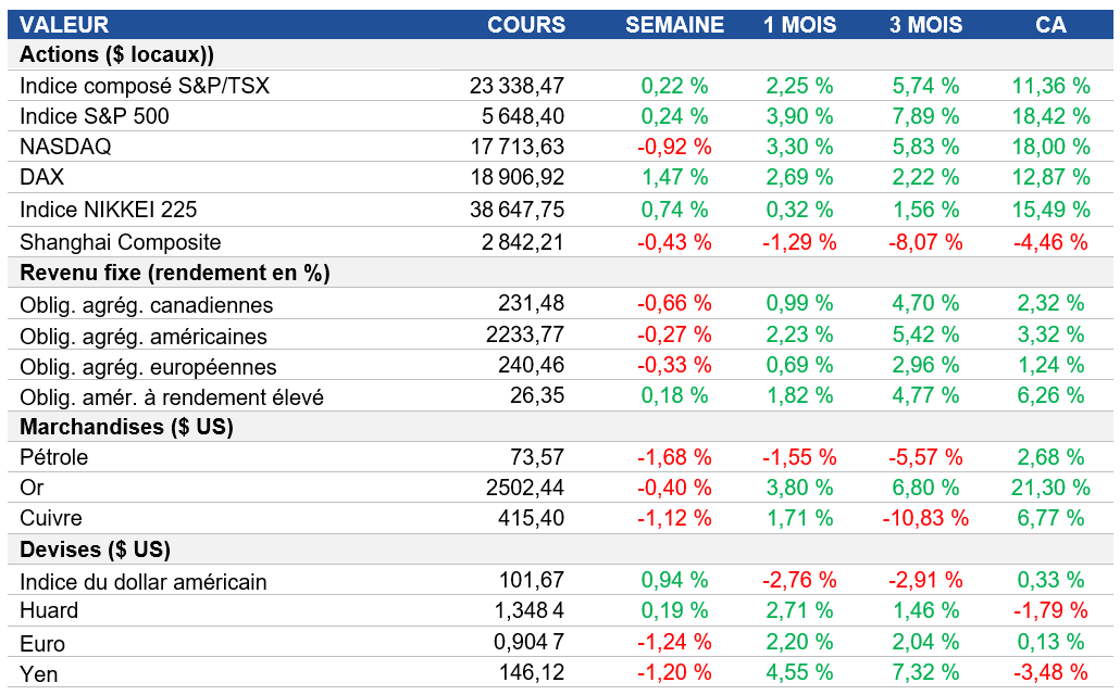 Actions : Les actions nord-américaines ont terminé la semaine en baisse en dépit des plus récentes données économiques qui montrent que l’économie se porte bien. Malgré de solides bénéfices, l’action de Nvidia a chuté de plus de 8 % au cours de la semaine, les attentes des investisseurs étant peut-être encore plus élevées en raison de la performance récente de la société et de l’engouement général pour l’IA.