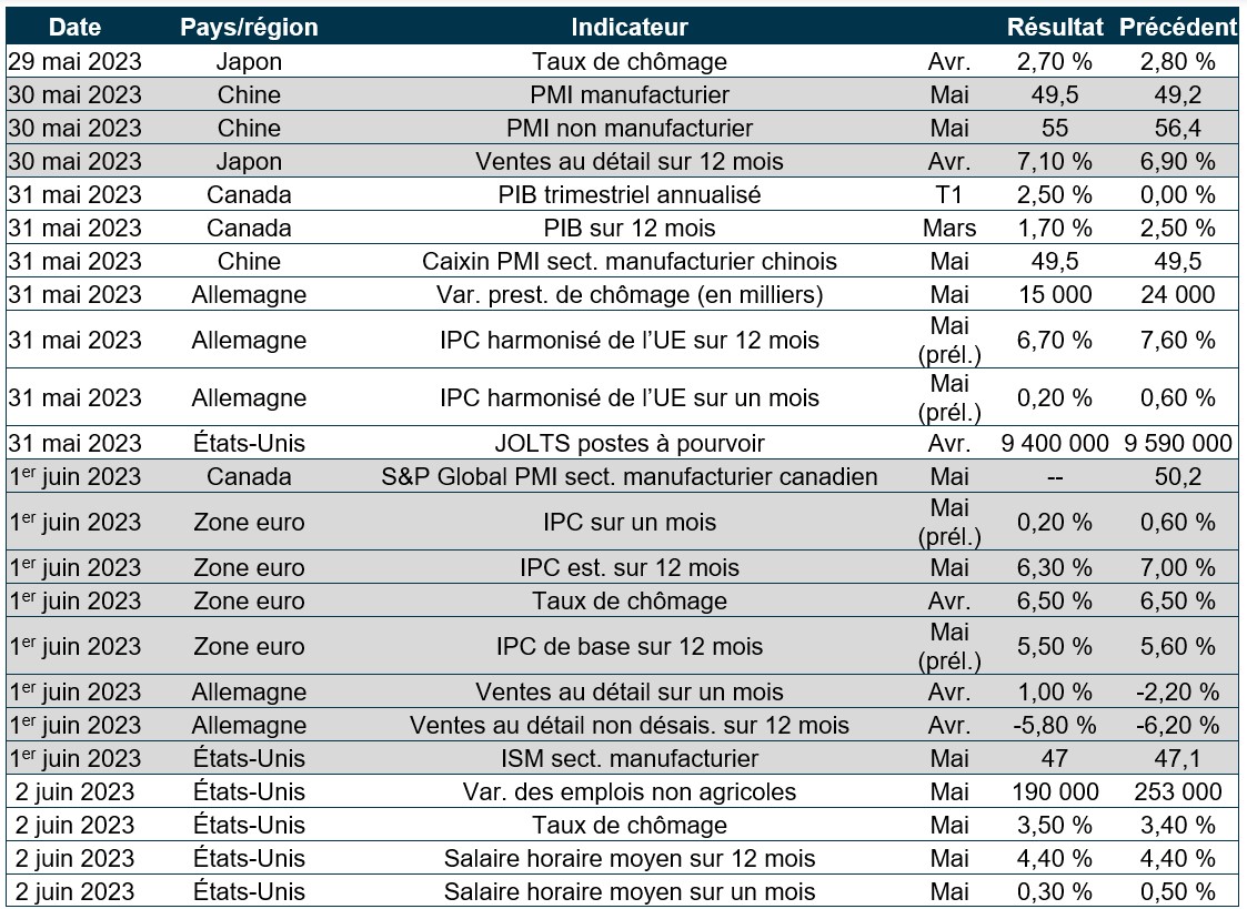 Actions : Le marché boursier a encore progressé cette semaine en raison de l’enthousiasme suscité par l’intelligence artificielle (IA) et de la plus grande conviction qu’une entente sur le plafond de la dette sera conclue aux États-Unis. L’indice S&P 500 a avancé de 0,3 % et le NASDAQ, à forte coloration technologique, a bondi de 2,5 %, après la publication des résultats de Nvidia Corp., qui ont fait grimper le cours du titre de 32 %. En plus de l’optimisme à l’égard de l’IA, les progrès dans les négociations sur le plafond de la dette aux États-Unis ont contribué à l’humeur positive des marchés, alors que le président de la Chambre des représentants, Kevin McCarthy a exprimé sa confiance à la suite des avancées récentes. L’indice S&P 500 a clôturé à plus de 4200 points pour la première fois depuis août 2022.