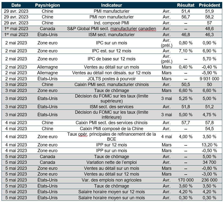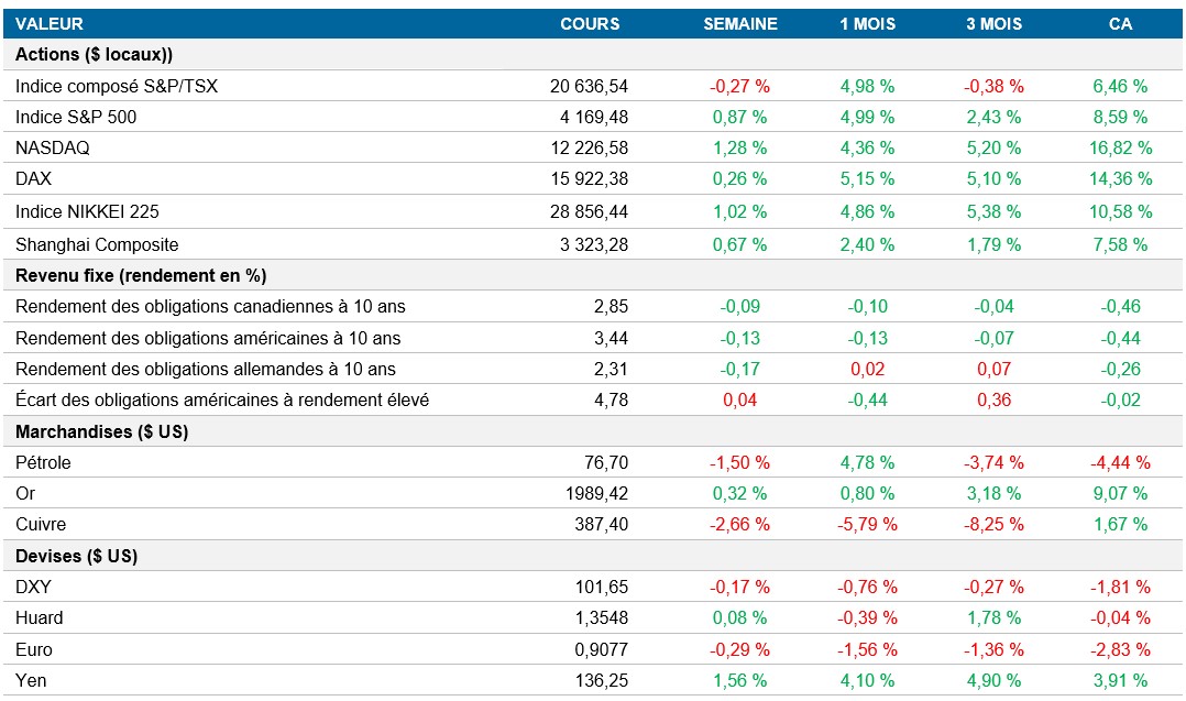 Actions : Les actions américaines ont poursuivi leur remontée vendredi, l’indice S&P 500 ayant progressé de 0,8 % (0,9 % au cours de la semaine), en raison des bénéfices supérieurs aux attentes d’Exxon et d’Intel. Les gains en début de séance ont été freinés par les fluctuations de mi-journée après que les dirigeants de la Réserve fédérale ont plaidé en faveur de vastes changements aux règles bancaires. Le NASDAQ a gagné 0,7 %, plombé par le recul de 3,4 % de l’action d’Amazon après la mise en garde sur la croissance de son secteur clé de l’infonuagique et par les pertes d'environ 40 % de la First Republic Bank après la mise sous séquestre de la FDIC. Les investisseurs sont préoccupés par l’incertitude entourant les hausses de taux d’intérêt de la Réserve fédérale, les nouvelles données sur l’inflation ayant montré une augmentation de l’indice des prix des dépenses personnelles de consommation. Les actions américaines devraient terminer le mois en hausse de 1,2 %.